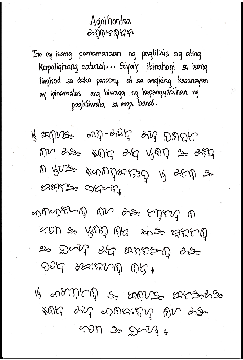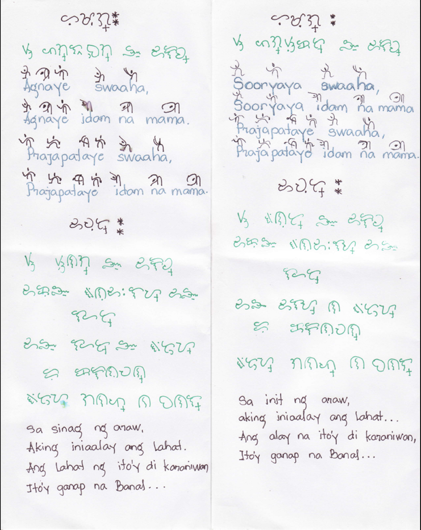 Above is about Agnihotra mantra body movements and in Filipino version, written in Baibayin.